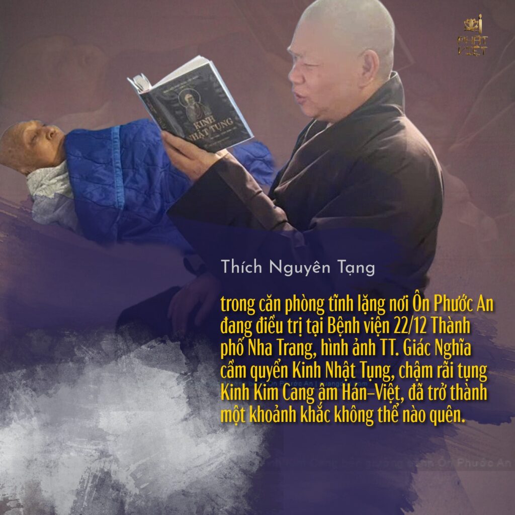 Ngày 1 tháng 2 năm 2026, trong căn phòng tĩnh lặng nơi Ôn Phước An đang điều trị tại Bệnh viện 22/12 Thành phố Nha Trang, hình ảnh Thượng Tọa Giác Nghĩa (Trụ trì Chùa Vạn Đức & Chùa Phước Trí, Nha Trang) cầm quyển Kinh Nhật Tụng, chậm rãi tụng Kinh Kim Cang âm Hán–Việt, đã trở thành một khoảnh khắc không thể nào quên.
